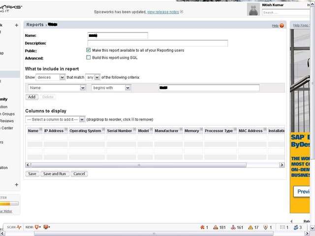 Create a new report, name it and add columns as per your requirement or even add conditions for making inventory for some specific group of devices/ workstations like I went for all workstations, whose names might be starting with “IT-“. Columns added in my case were Name, IP Address, Operating System, Serial Number, Model, Manufacturer, Memory, Processor Type, MAC Address and Installation Product Key