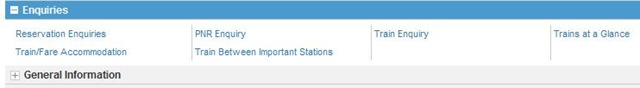 enquiries Probably still most of the people access the railways website for one reason PNR enquiry or finding the availability info about various trains. the second menu Enquiries takes care of those all and bring them all at one single place.