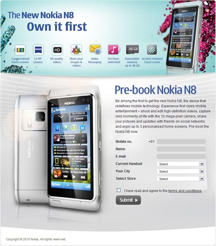 Nokia N8 is available on Pre-order for Indian Customers since September 29, 2010 on the site given below