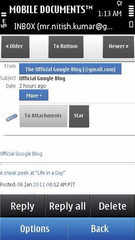 Its a little different than the one and though pinch to zoom is not here yet, but addition of To Top and To Bottom buttons really been a nice thing to happen (older and newer buttons are already there in Nokia Messaging too). While I was missing pinch to zoom and the mail HTML display is also seems to be different here, the loading of mails is definitely better than ever and so is the Push performance (at least on Symbian^3 devices, NM Push sucks as of now).