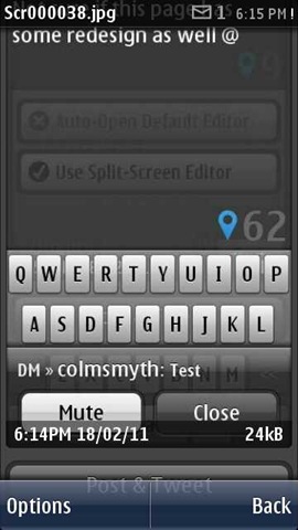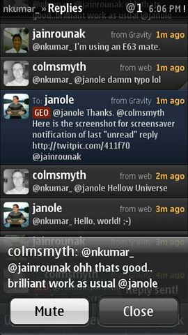 But one should also note the fact that these pop up dialogue boxes will appear on only S60 v5 and S^3 versions of Symbian, not on versions before it though real time push notifications are available for all the platforms. Many a times, you will see notifications coming one or half a second earlier than the tweet actually appears, but most importantly with push enabled, you can safely put the auto-update settings for replies and DM on None.