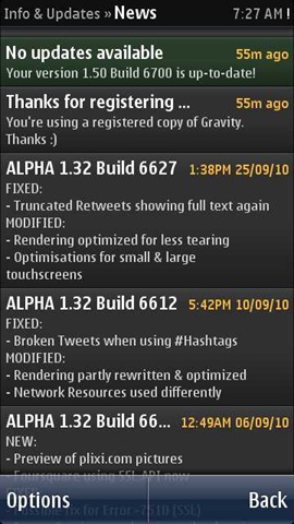 Finally Gravity has become the first symbian twitter client to add the inline translation feature, which means you can read those Russian or Urdu tweets directly and don’t need to run to the PC now. Though as of now there is no change of appearance for a translated tweet (like some different color), it is expected to be seen in the next update.