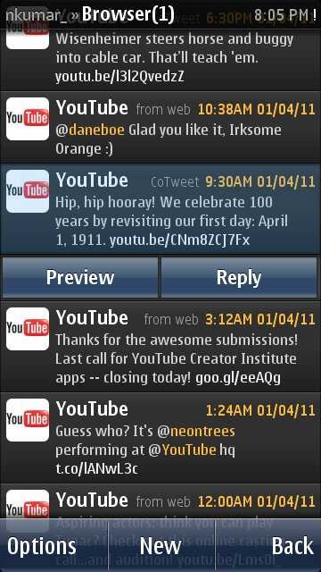 Though as of now, YouTube feature is limited to Symbian^3 phones only due to the fact that @janole not happy with crappy 176x resolution of RTSP streaming (current implementation making use of iPhone MP4, 640×360, 480×360), but it might make its ways to S60 very soon. Though Facebook section is still facing difficulty in detecting YouTube/Vimeo links due to improper handling, I’m sure it’ll be fixed soon.