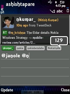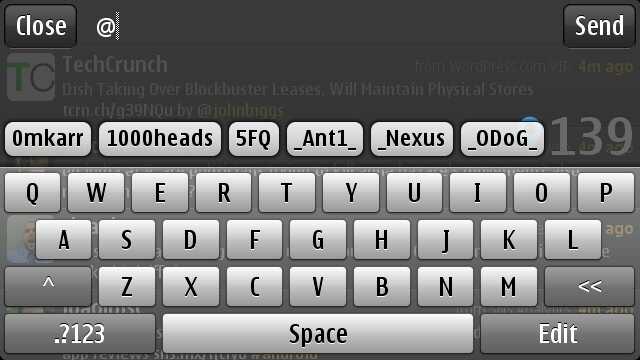 For Symbian^3 and S60 V5, you can notice that auto completion now starting with typing of ‘@’ only, otherwise it was waiting for one more word earlier. Same for Hash Tags as well.