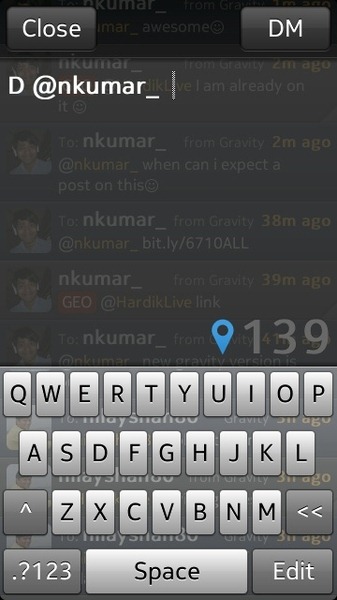 Interesting to note the fact that as per @janole Gravity indexes the names at the runtime, when the virtual keyboard opens (The same keep the list updated again). I was a little skeptical about the performance impact due to the same for people having long number of friends or followers but for my utter surprise, I didn’t felt even a momentary lag in opening the virtual QWERTY on my Nokia N8. I still will wait for comments from lower models users like Nokia 5800, but that certainly enhances the usability drastically. See the below screenshot on how to quick send DM. (Thanks to @HardikLive)