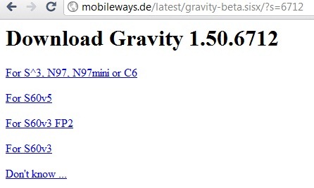 3. Another change is the way, you download the Gravity betas till now, Though its still the standard link like this http://bit.ly/6712ALL. and permanent URL like this http://mobileways.de/latest/gravity-beta.sisx, but now the default page when opened from desktop browser, offers you options like this