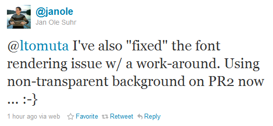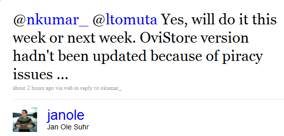 Though in same reference, still what remains due over @janole is to upload the latest version in Ovi Store where one gets only some old 1.32 version and also update the info and updates section to reflect the latest build. I guess then he would also be needed to write a changelog on every update 😉