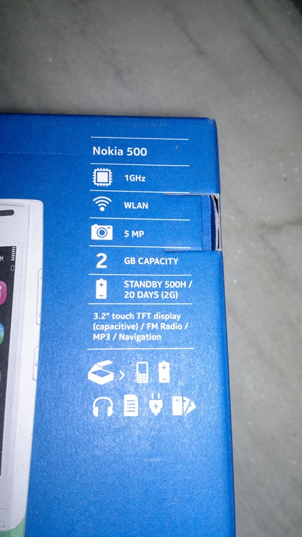 As written on the box, the prominent feature about Nokia 500 is 1GHz ARM processor. Rest usual goodies like 5MP Full Focus Camera, HSDPA Cat10 14.4 Mbps and HSUPA Cat6 5.76 Mbps, 256 MB RAM, 512 MB ROM, 2Gb mass memory, 32 Gb MicroSD support, WLAN IEEE 802.11 b/g, Bluetooth 2.1 +EDR, Accelerometer Sensor, Ambient Light Sensor and Compass (Magnetometer Sensor) fall in place with Nokia 500.