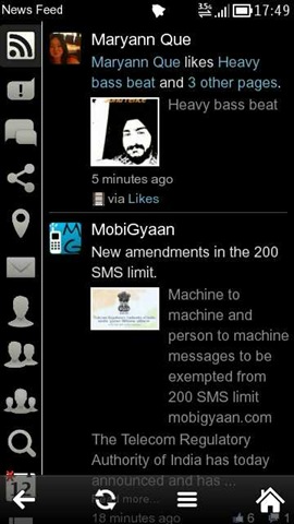 Tapping the News Feed icon takes you into Facebook Feeds of your friends, which might be presented to you in multiple ways as per your settings like you may choose to have the left side tab navigation (as shown above in left screenshot) or may choose to have a full view (like the right screenshot). You may make the bottom bar transparent or opaque.