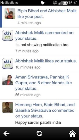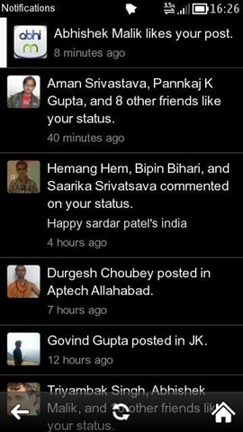 Next is notifications, which will notify the presence of themselves with a snap kind of sound and then will sit as a number in red bubble on top right of the notifications icon. Notifications are listed just like News Feed with Belle style menu bar in the bottom. Unread notifications will have a blue or white bar on the left and tapping on individual notification will take you to particular update.