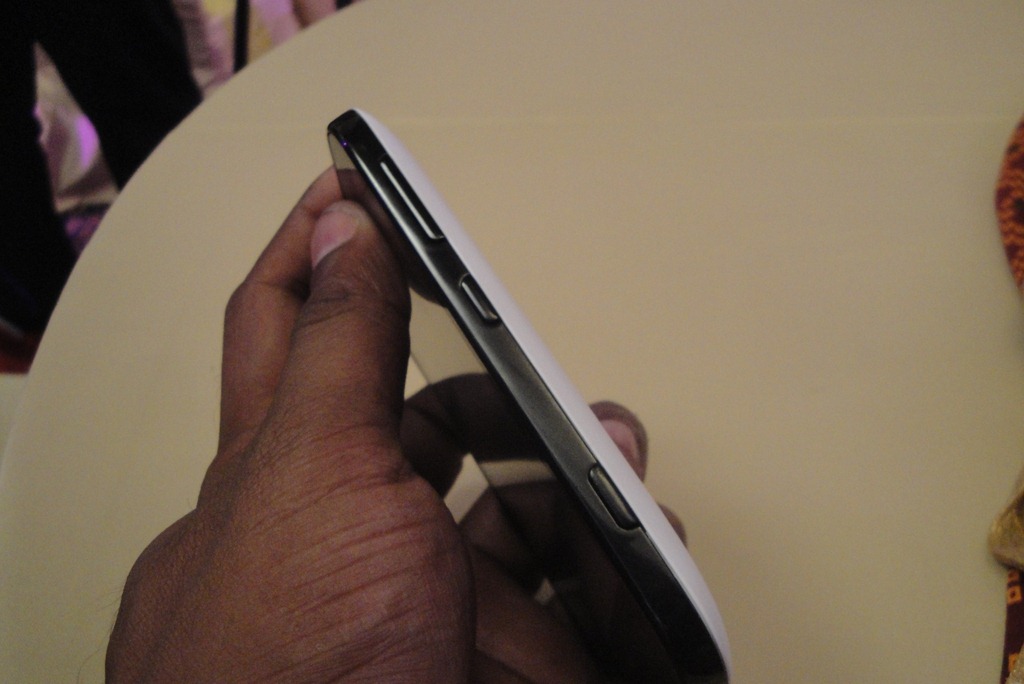 The right side of the device contains the lock-cum-power button, physical camera shutter and volume keys.