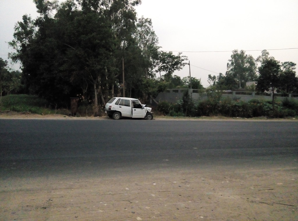 Passed through some typical Punjabi areas with beautiful Guruwaras by side of the roads and finally stopped for tea by 6.30 or earlier before Nangal. In front of the Dhaba, there was this vehicle which seemed to have met a horrible fate. It was a reminder to me to keep speed in check even when I was willing to finish the journey faster.