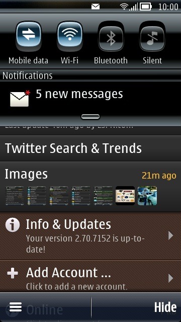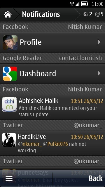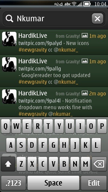 For me, the issues in this approach is, Gravity has an option to tap on top to move to top of the timeline and with two status bars (One of system and one of Gravity), it becomes a lot confusing. You have to hit the status bar precisely to get to top because if you hit top most system bar then it might be lead to system drop down that might annoy you. Moreover, the pixel size of the new Status bar is almost doubled means loss of screen space on already low resolution Symbian screens. I think @Janole also agree on it.