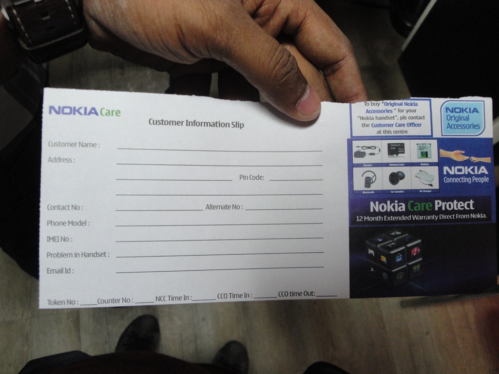 As you can see, this system removes the middle man carrying up your tokens and subsequent order no. The new system is very transparent in its functions. While the centralized reporting helps Nokia in further improvements, but it also improves the turnaround time with per call. DSC05199Along with token, you also needed to fill Customer Information Slip for record purpose, so that Nokia may contact you about your experience if required.