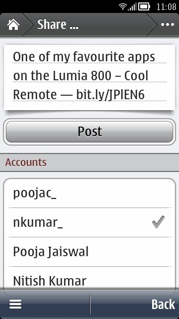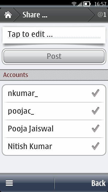 12. Last but not least, option to share status on multiple networks finally: Yeah! finally you can share the same status on multiple social network accounts at once (facebook\Twitter}. All you need to do is to swipe your finger from left to right or right to left on Add Account section and you will get the screen given below: