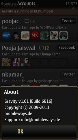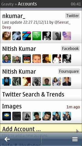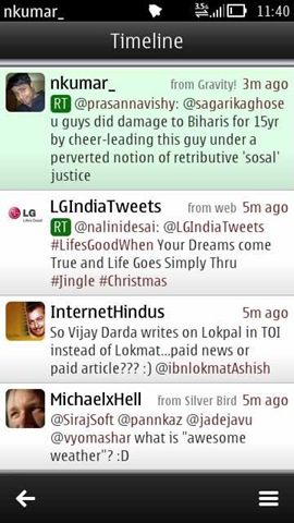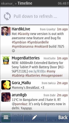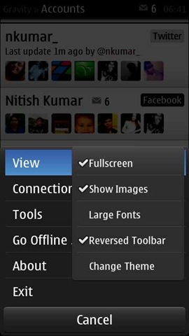 For me, the issues in this approach is, Gravity has an option to tap on top to move to top of the timeline and with two status bars (One of system and one of Gravity), it becomes a lot confusing. You have to hit the status bar precisely to get to top because if you hit top most system bar then it might be lead to system drop down that might annoy you. Moreover, the pixel size of the new Status bar is almost doubled means loss of screen space on already low resolution Symbian screens. I think @Janole also agree on it.