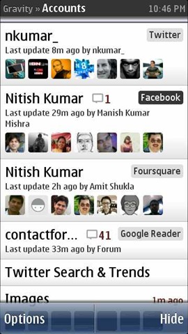For me, the issues in this approach is, Gravity has an option to tap on top to move to top of the timeline and with two status bars (One of system and one of Gravity), it becomes a lot confusing. You have to hit the status bar precisely to get to top because if you hit top most system bar then it might be lead to system drop down that might annoy you. Moreover, the pixel size of the new Status bar is almost doubled means loss of screen space on already low resolution Symbian screens. I think @Janole also agree on it.